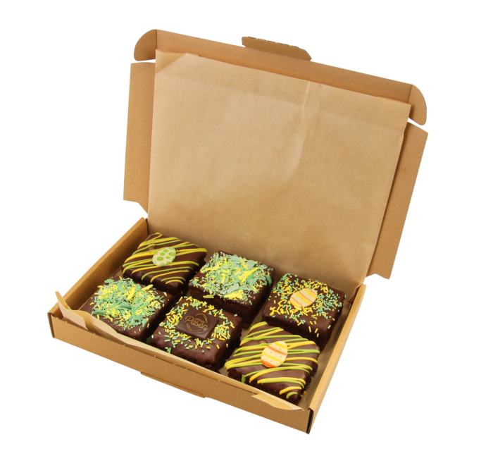 Smeuïg, chewy én van pure chocolade. Een brownie op zijn best zoals onze bakkers dat dan noemen. Gedecoreerd met verschillende Paasversiering en gele en groene hagel. Deze brownies kunnen worden voorzien van een kaart voor je familie, vrienden of collega of van een eigen logo.