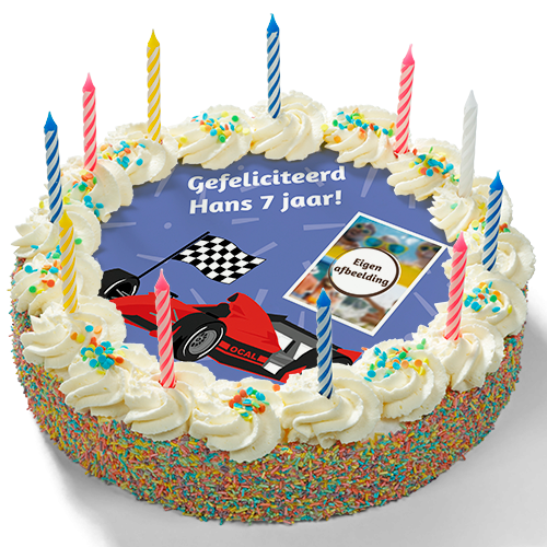 Vroemmmmmmm deze raceautotaart rijd zo je mond in. Deze unieke ronde taart met logo is gevuld met echte slagroom, gemaakt van een luchtige cake, aangezet met chocolade hagel en gedecoreerd met eetbare confetti.