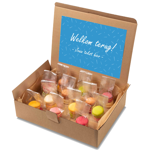 REDVELVET MACARON Chocolade wit: suiker, cacaoboter, volle melkpoeder, melksuiker, magere melkpoeder, Emulgator (sojalecithine); suiker; Boter: boter (bevat melk ); Vanille pasta: suiker, glucosesiroop, Gesuikerde gecondenseerde melk , water, smaakstoffen (natuurlijke aroma), zout, gemalen Vanille stokjes, verdikkingsmiddel (agar-agar,-pectine), Kleurstof (paprika-extract), Vanille extract bourbon van Madagaskar 2,5%; Verse Roomkaas 25%: verse melk, room, zout, Verdikkingsmiddel (johannesbroodpitmeel), zuursel, stremsel; Botercréme: suiker, gemodificeerd zetmeel (E1422, wei poeder (melk), dextrose (tarwe), Glucosesiroop (droog), geleermiddel (E339, E450, E516, E401), emulgator (E435), zout, Verdikkingsmiddel(E415), smaakstoffen; Macaron: suiker, amandelmeel, eiwit, conserveermiddel (E202), stabilisator (E412 en E415), voedingszuur (E330), kleurstof (E122)