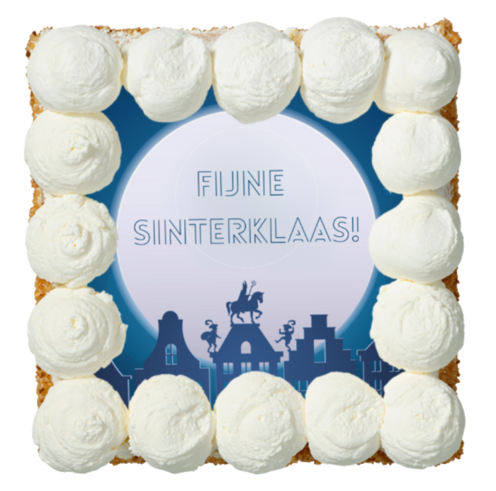 Een feestelijke slagroomtaart met de opdruk “Fijne Sinterklaas!”, omringd door royale toefjes verse slagroom. De luchtige biscuit en romige vulling maken deze taart tot een klassiek genietmoment tijdens het Sinterklaasfeest.