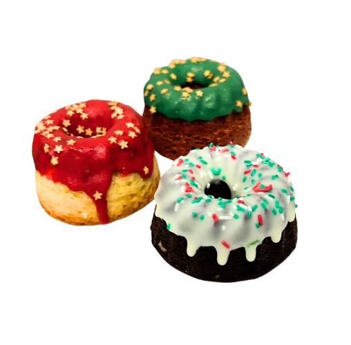 De Mini tulband Kerst is een vrolijke en smaakvolle traktatie in feestelijke stijl. Deze kleine tulbandjes zijn gedecoreerd met glazuur in kerstkleuren – rood, groen en wit – en afgewerkt met sterretjes en sprinkles voor een speelse uitstraling.