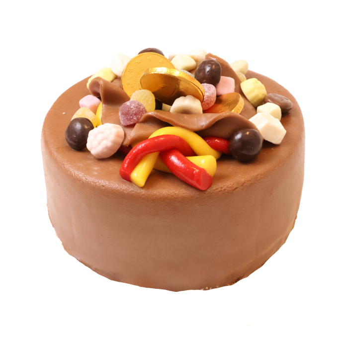 Een feestelijke Zak van Sinterklaas taart van zachte marsepein, gevuld met romige vanillecrème. De taart is vormgegeven als de iconische zak vol lekkers, versierd met vrolijk snoepgoed, chocoladeletters en gouden munten voor een echte Sinterklaasbeleving.